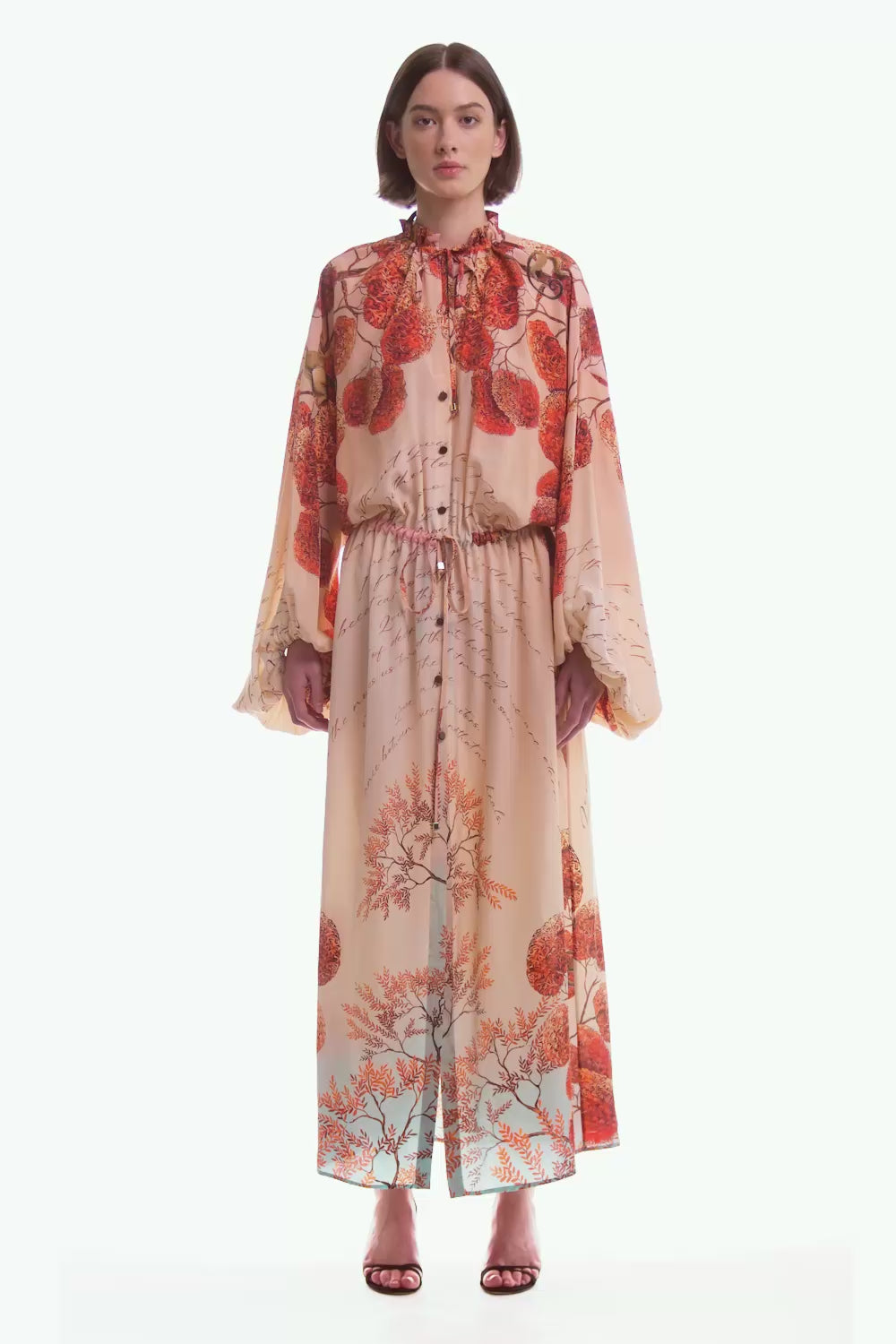 Crafted from 100% silk crepe, this dress features a shirt-style neckline with a subtle Korean collar, adjustable drawstrings at the neck and waist, and oversized sleeves. The buttoned skirt with a wide front slit adds fluidity and movement, creating a sophisticated and contemporary silhouette.