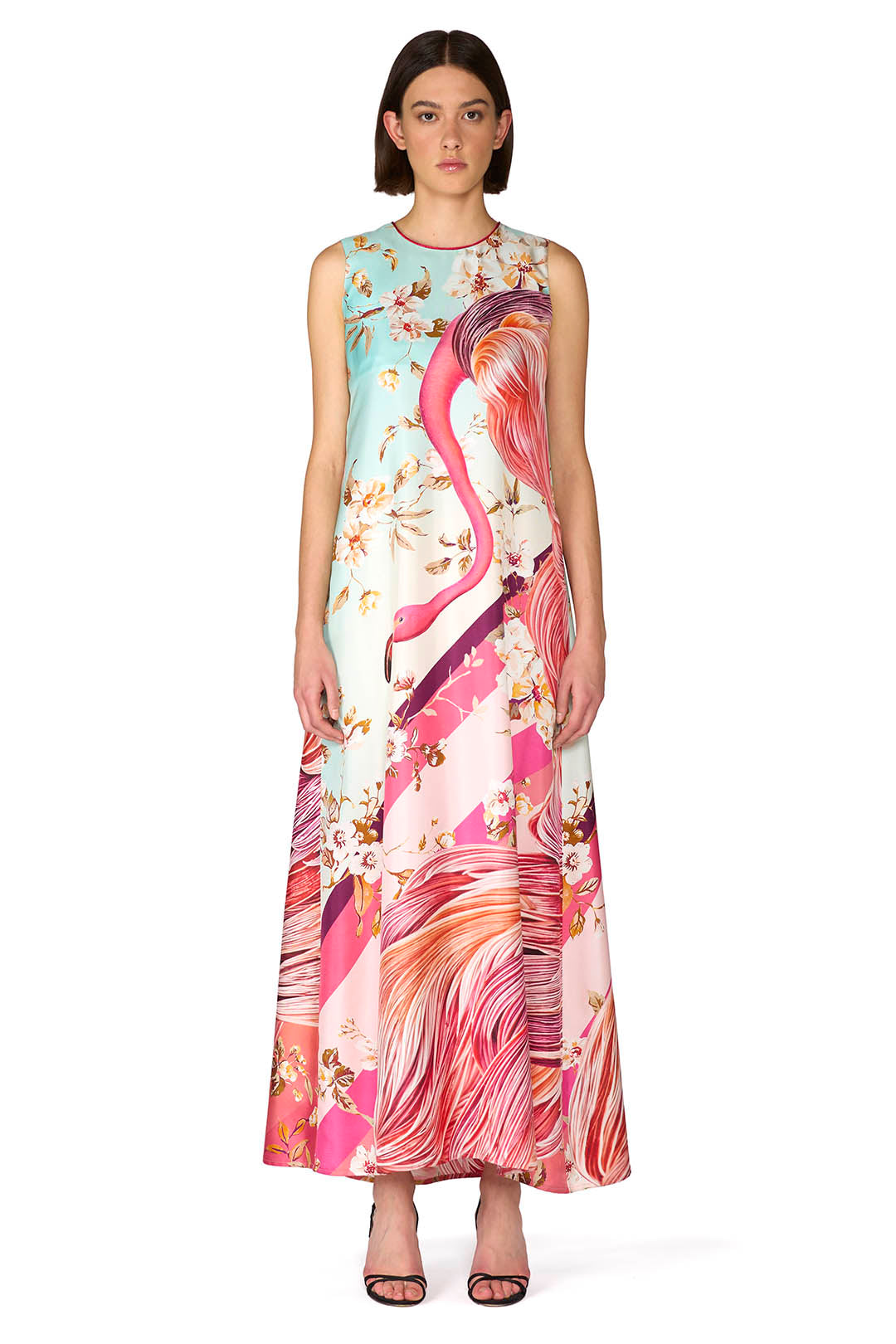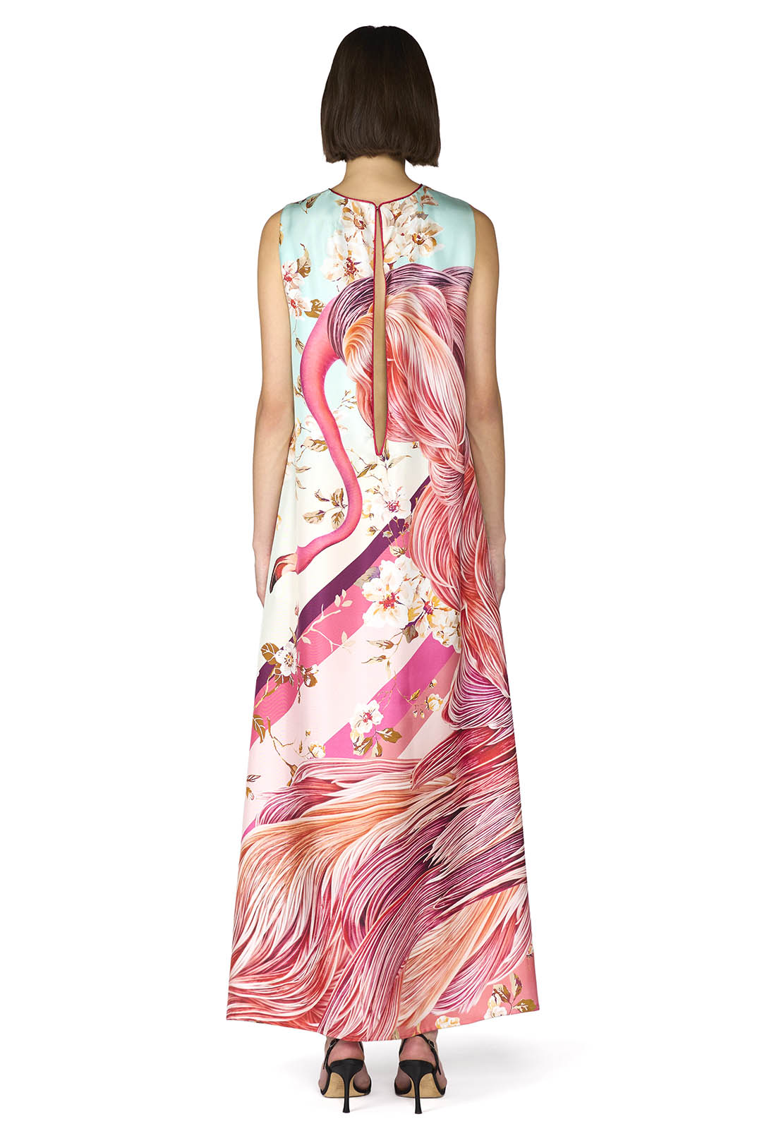 Crafted from luxurious silk, this long sleeveless dress in silk velvet devoré features a timeless round neckline and a striking deep V-back. Slightly flared at the bottom, it flows with graceful movement and subtle texture, creating an effortlessly refined silhouette. Made in Italy with exquisite attention to detail.