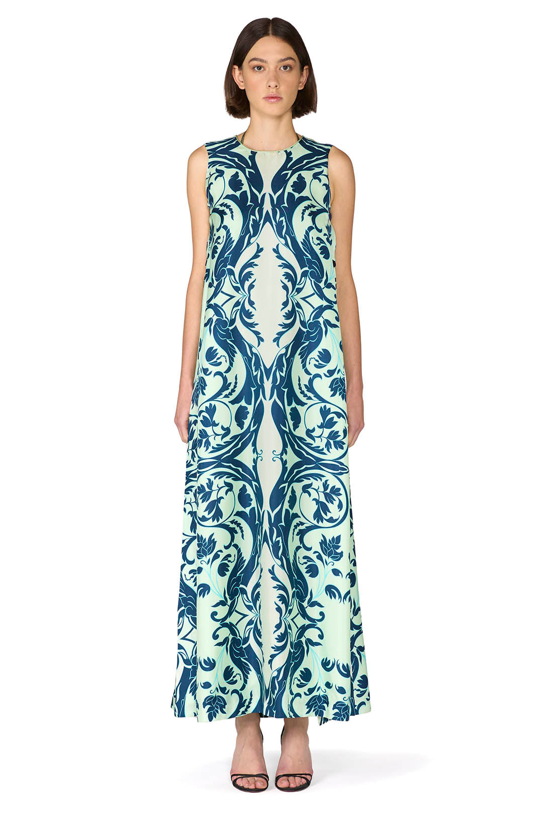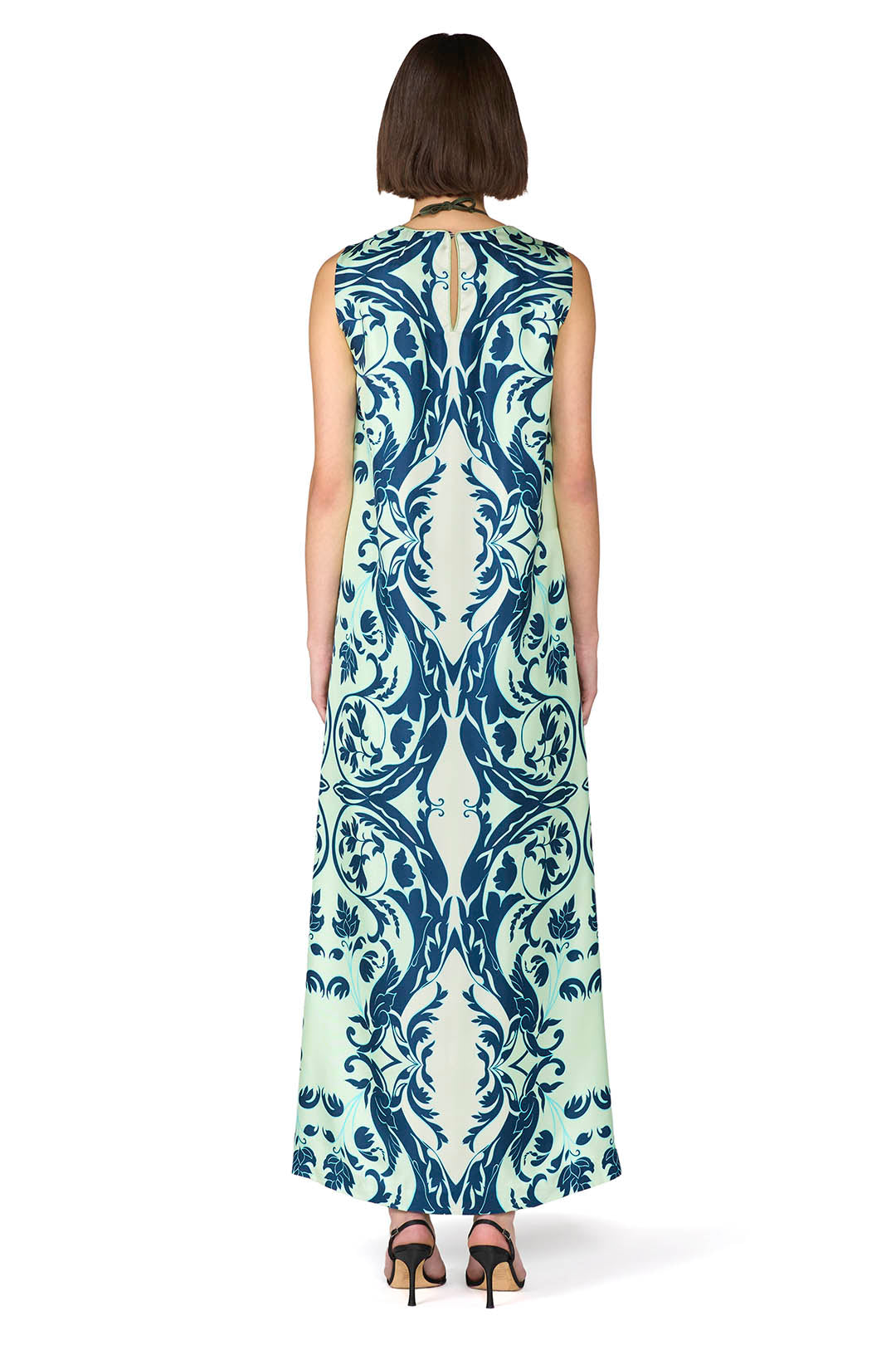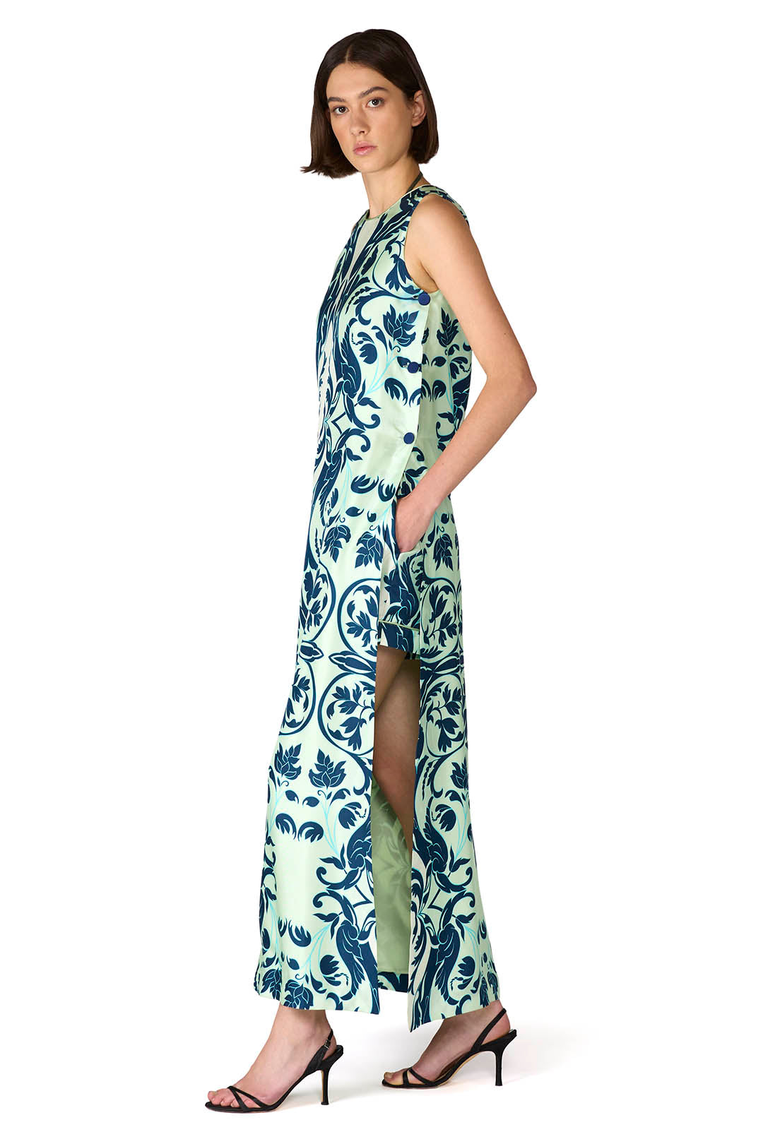 Crafted from silk twill, this long sleeveless dress features a classic round neckline and side slits extending up to the waist, creating a bold yet refined silhouette. Designed to be worn layered over shorts or trousers, it offers versatile styling with a modern, effortless edge.