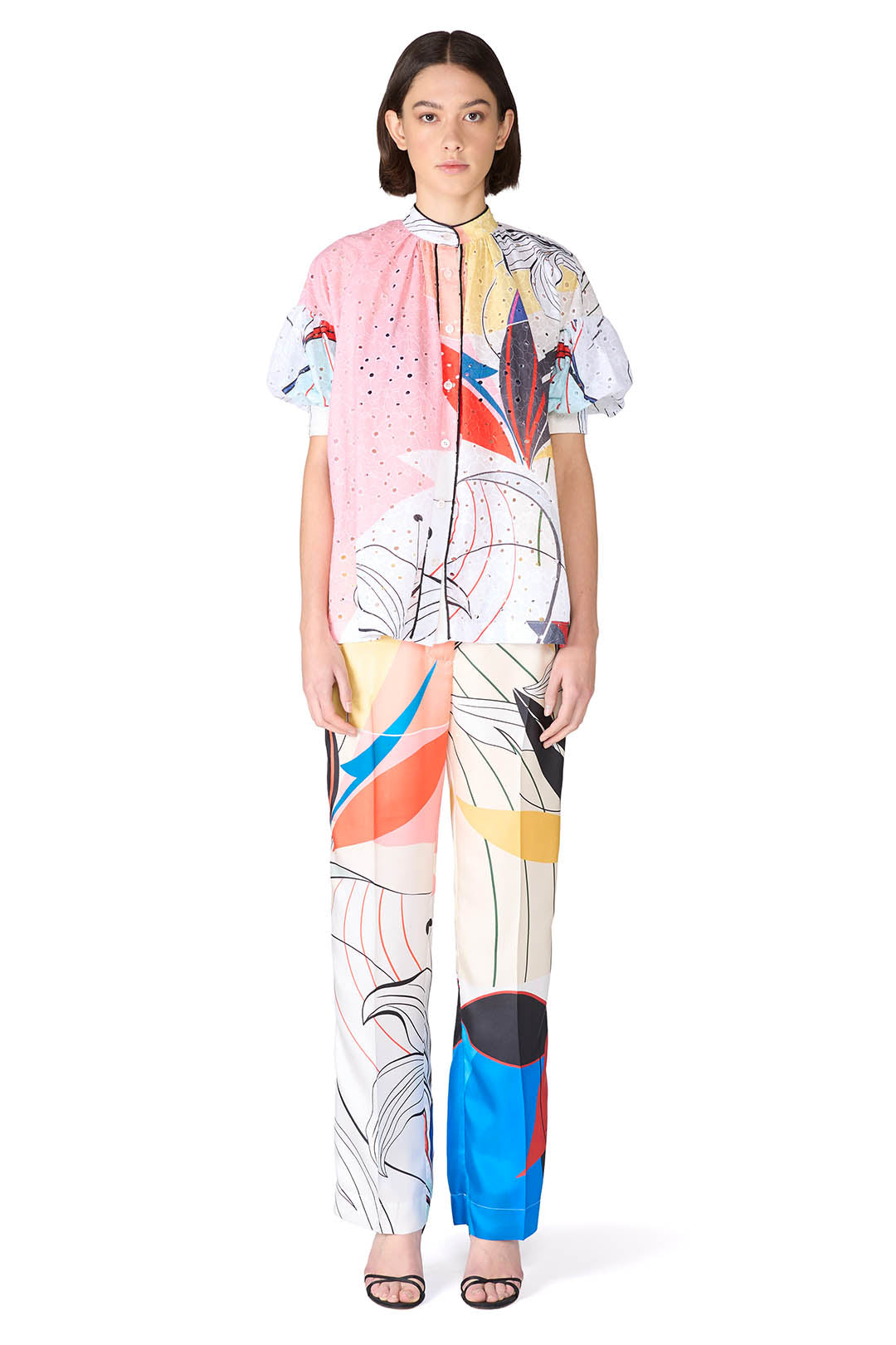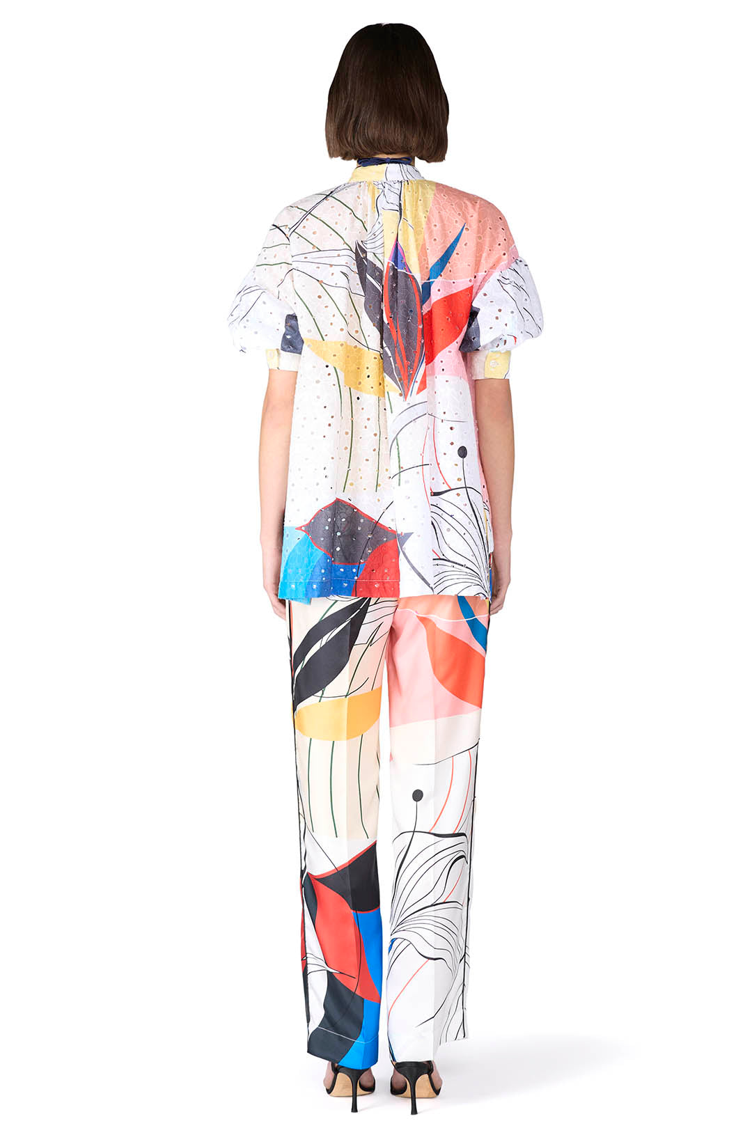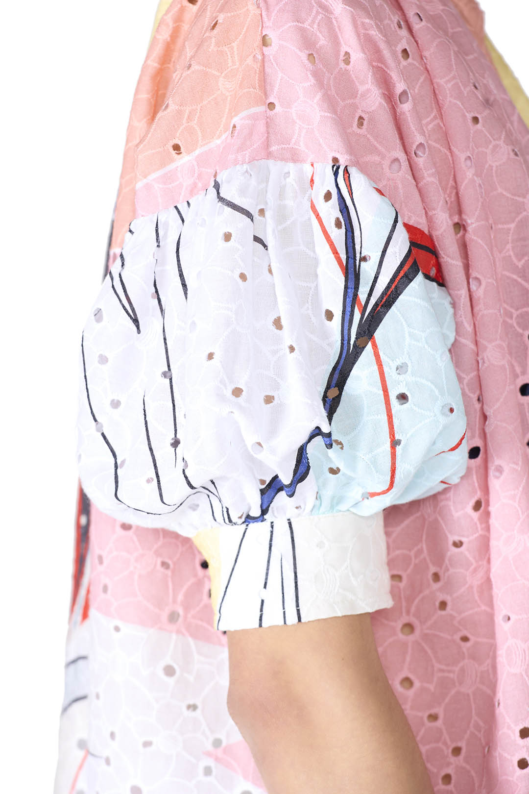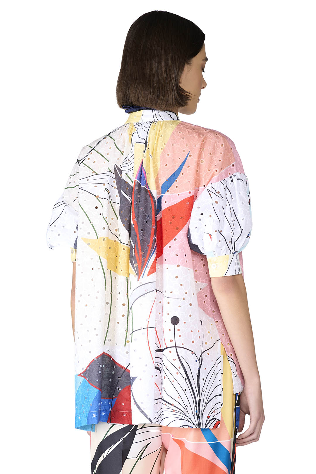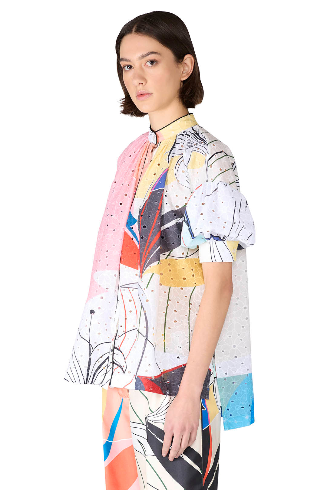 This 100% cotton broderie anglaise shirt features dropped shoulders, short oversized sleeves, and a Korean collar for a modern, airy silhouette. Its relaxed fit combines casual comfort with delicate detailing.