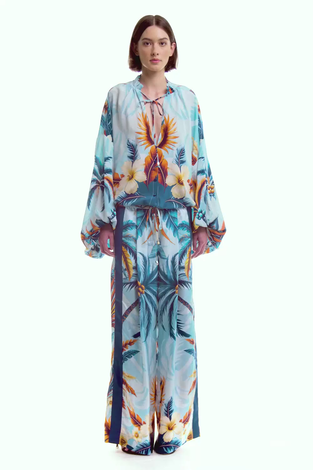 These large-fit silk twill pants offer luxurious comfort and style, featuring an elastic waistband for easy wear, sharp front pinces for tailored structure, and grosgrain bands applied for a distinctive finish. Crafted from 100% silk and made in Italy, they perfectly blend elegance with practicality.