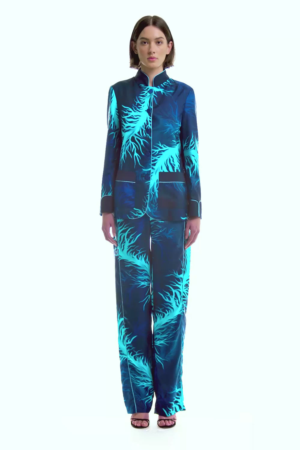 These silk twill trousers feature an elasticated back waist and a front button closure, combining comfort with a polished, elegant silhouette.