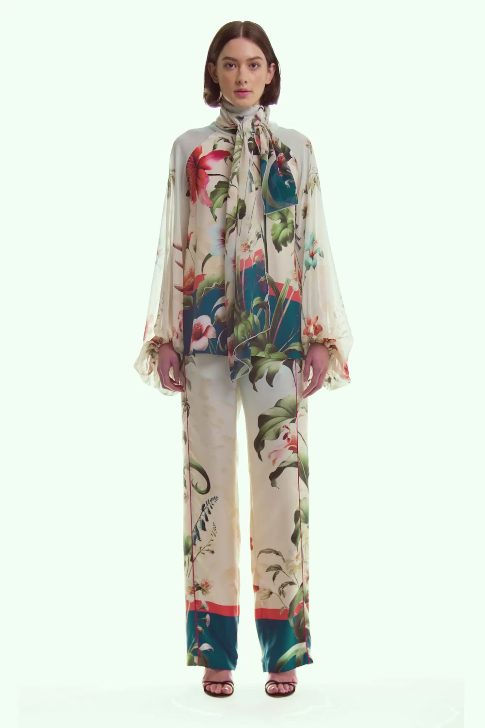 These silk twill trousers feature an elasticated back waist and a front button closure, combining comfort with a polished, elegant silhouette.