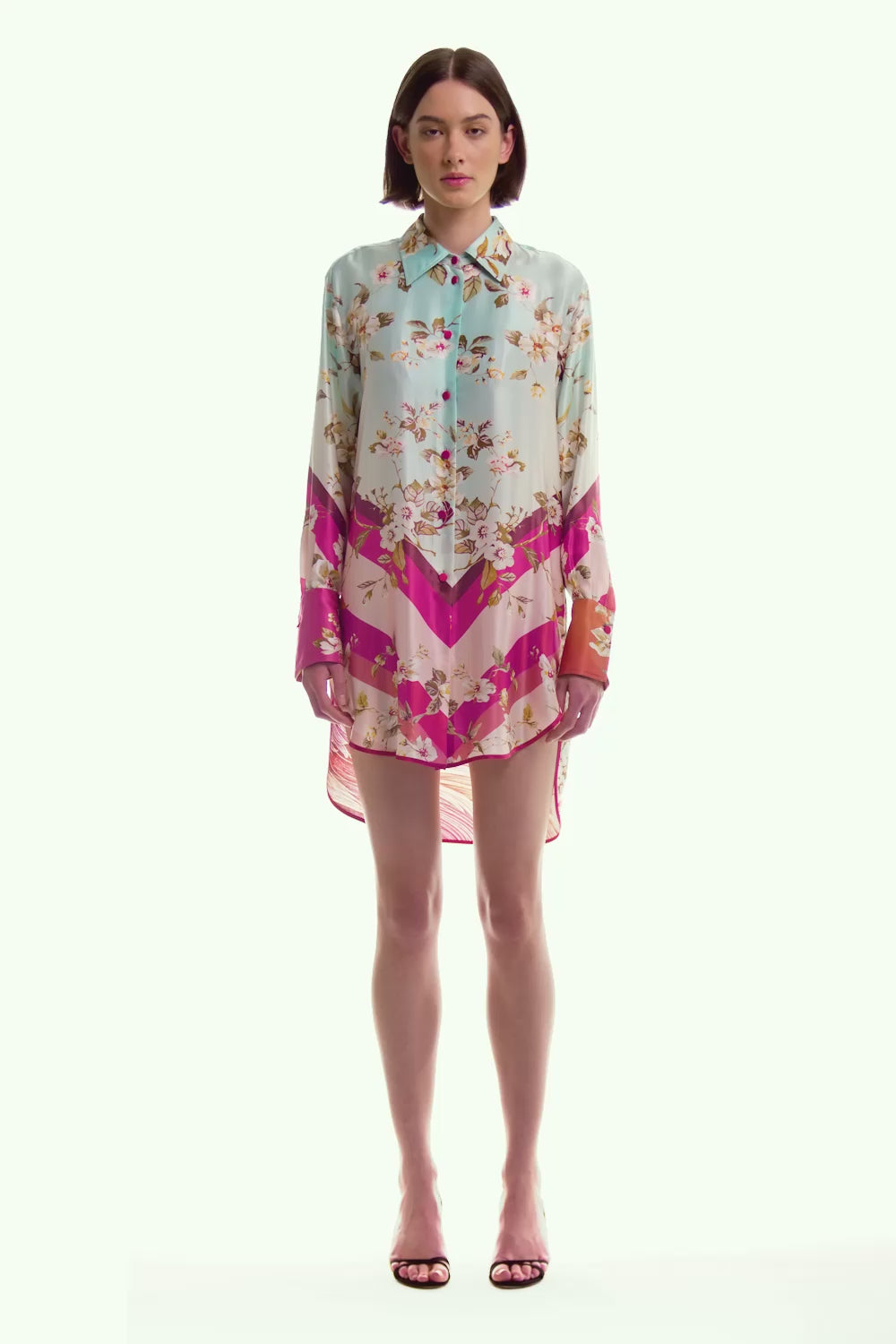 Crafted from silk viscose satin, this short shirt dress features long sleeves and a slightly longer back hem for a modern, fluid silhouette. Designed to be worn on its own or layered over trousers, it offers versatile styling with a refined, effortless feel.