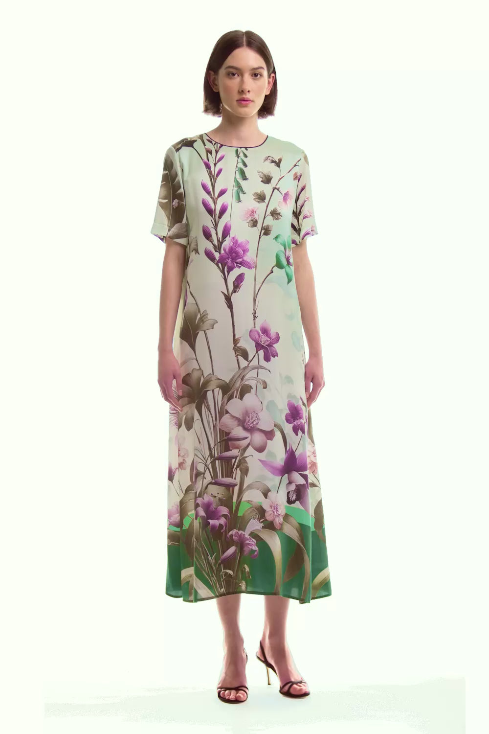Crafted from silk twill, this long sleeveless dress features a scarf neckline tied at the back, adding a refined and distinctive touch. The fluid silhouette enhances movement while maintaining a clean, sophisticated look. A timeless piece designed for effortless elegance.