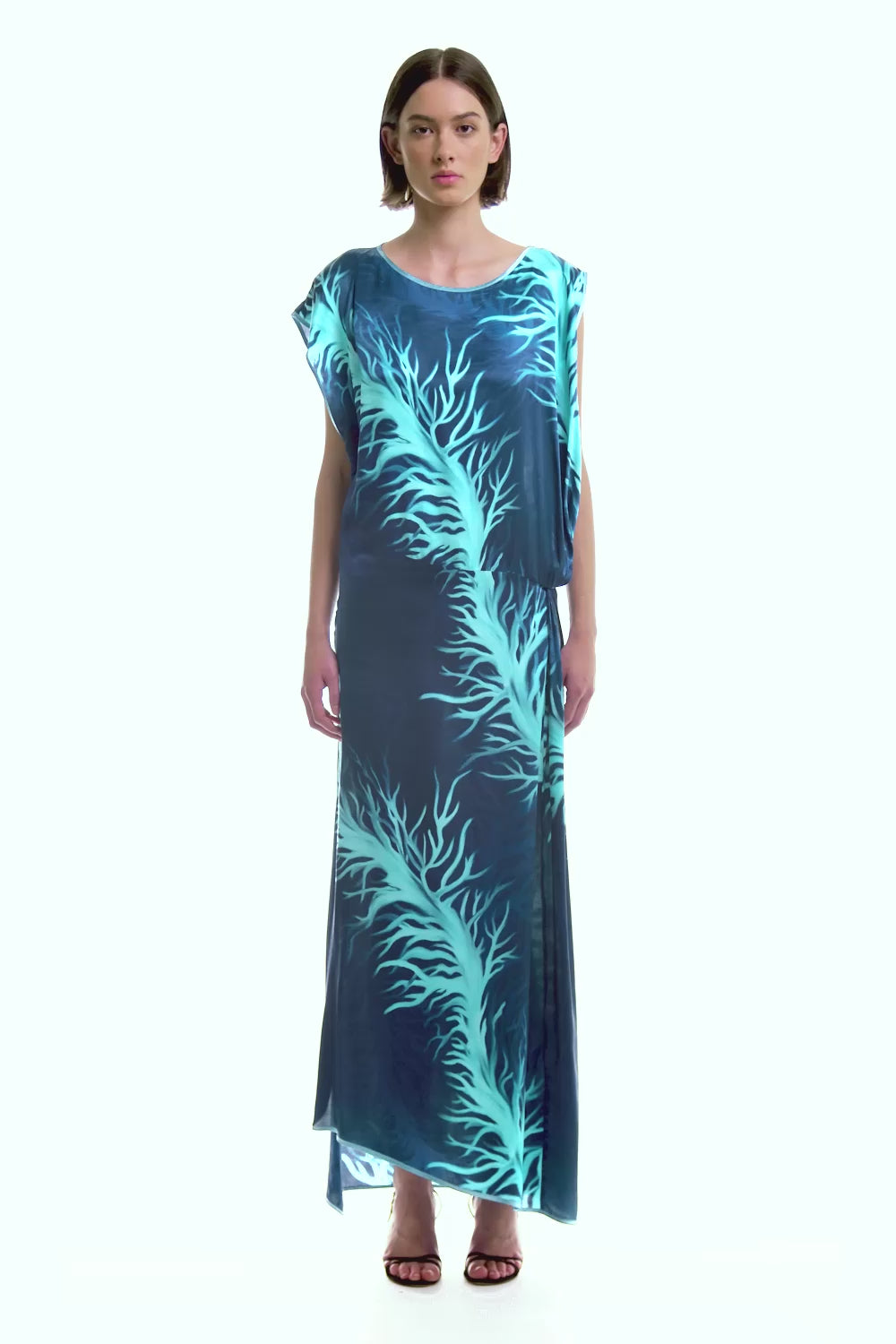 Crafted from silk viscose satin, this sleeveless dress features asymmetric shoulders and subtle draping at the waist, creating a slim, flattering silhouette. Designed for a refined and modern look, it embodies effortless sophistication.