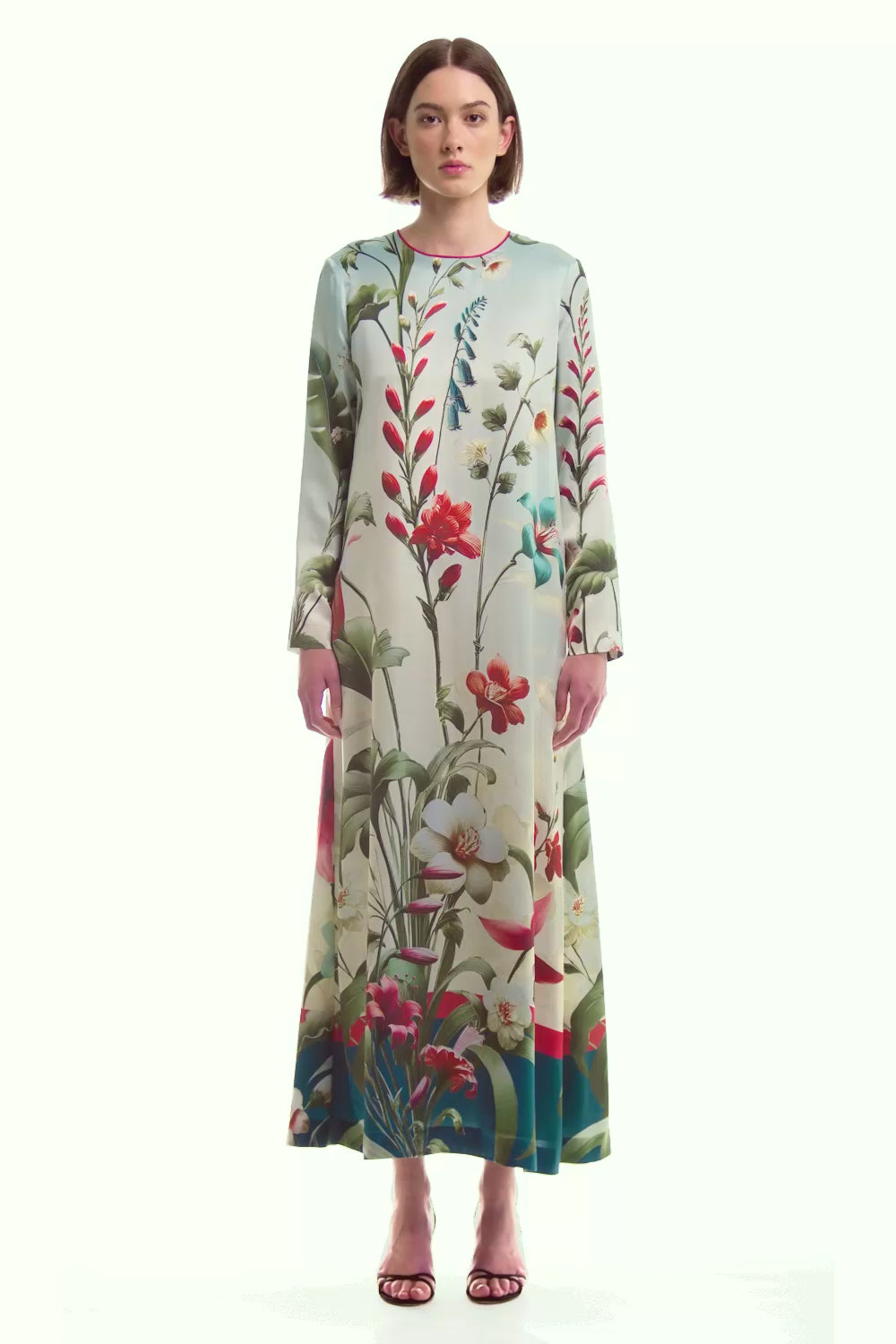 Crafted from silk viscose satin, this long dress features a classic round neckline and long sleeves, with a subtly flared hem that adds movement and balance to the silhouette. Discreet side seam pockets enhance functionality while preserving clean, refined lines. A versatile and timeless piece designed for effortless elegance.