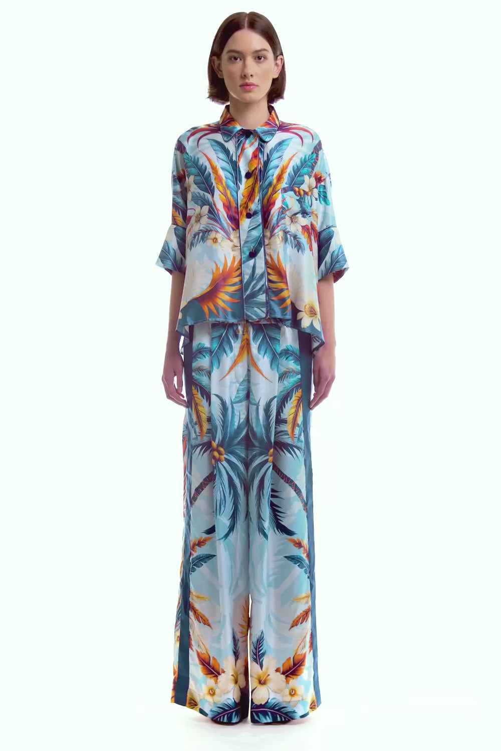 Crafted from silk viscose satin, this shirt features a classic pointed collar, a relaxed oversized fit, and three-quarter length sleeves. The hem is slightly longer and rounded at the back, creating a fluid, contemporary silhouette.